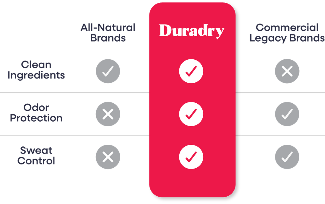 Duradry doesn’t just cover odor—it controls sweat and neutralizes odor at the source. Built for active lifestyles, it pairs maximum-strength protection with clean, skin-conscious ingredients and refined, subtle fragrances.